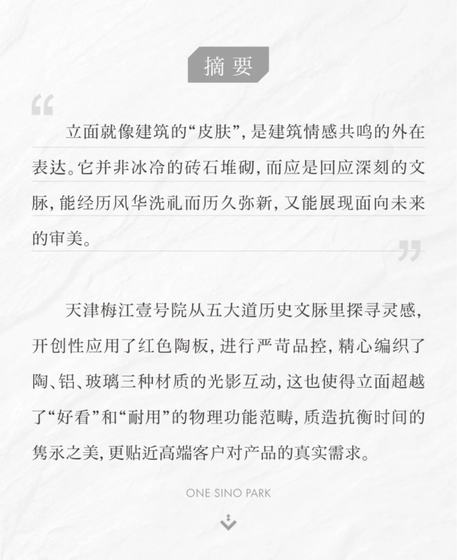 那里的红砖洋房,历经百年风雨,依然风采依旧,也一直是天津人心目中关于优雅、底蕴与身份的象征, 这种根植于城市记忆深处的“红砖情结”,成为梅江壹号院立面设计的灵感之源 。